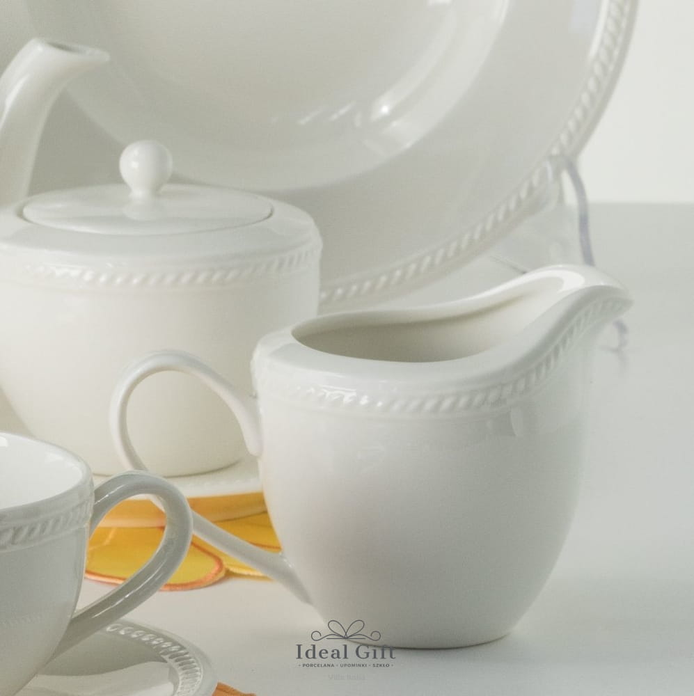 Mlecznik z linii Appal to pełna elegancji kolekcja szlachetnej ceramiki w mlecznym odcieniu. Proste, czyste linie naczyń i tradycyjny fason talerzy łączą w sobie elementy klasyki i nowoczesności. Charakterystycznym elementem dekoracyjnym wyróżniającym dzbanuszek do mleka lub śmietanki oraz całą kolekcję są delikatne, skośne karbowania imitujące skręconą tasiemkę oplatającą obrzeże naczyń. Proste uchwyty filiżanek, kubków, czajnika i mlecznika zostały dopracowane w najmniejszych detalach i gwarantują dużą wygodę użytkowania.