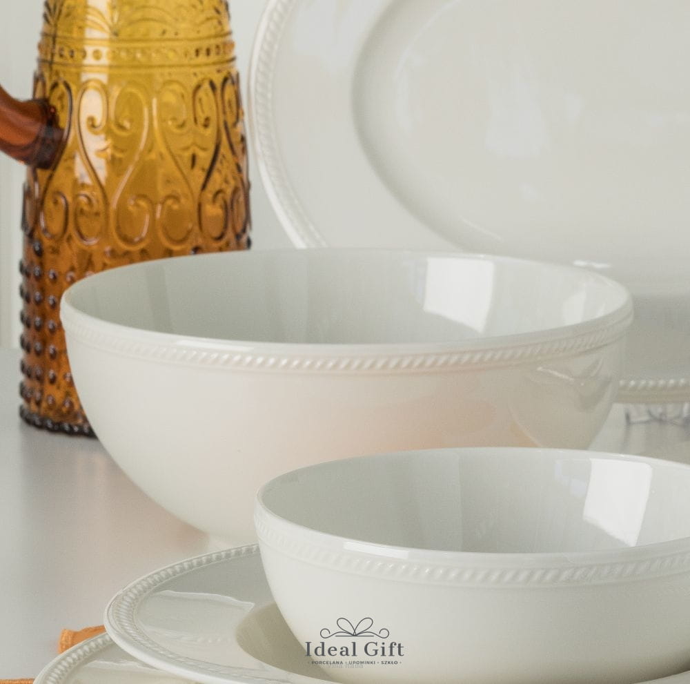 Salaterka z linii Appal to pełna elegancji kolekcja szlachetnej ceramiki w mlecznym odcieniu. Proste, czyste linie naczyń i tradycyjny fason talerzy łączą w sobie elementy klasyki i nowoczesności. Charakterystycznym elementem dekoracyjnym wyróżniającym Misę i całą kolekcję są delikatne, skośne karbowania imitujące skręconą tasiemkę oplatającą obrzeże naczyń. Proste uchwyty filiżanek, kubków, czajnika i mlecznika zostały dopracowane w najmniejszych detalach i gwarantują dużą wygodę użytkowania.