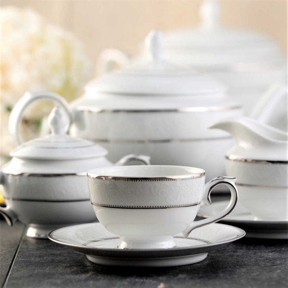 Filiżanki do kawy espresso ze spodkiem z kolekcji Azalia to śnieżnobiała, elegancka porcelana w klasycznym fasonie. Filiżanki do espresso i pozostałe elementy zastawy dekorowane są szerokim paskiem subtelnej, białej koronki z misternymi roślinnymi ornamentami. Dodatkowo obrzeża, uchwyty i stopki naczyń zostały wykończone ręcznie malowanym platynowym paseczkiem. Charakteru i lekkości dodają stopki oraz stylizowane uchwyty filiżanek, czajnika, cukiernicy, mlecznika, wazy, bulionówek. Filiżanka do kawy i cała kolekcja Azalia to doskonała, ponadczasowa propozycja, która sprawdzi się jako zastawa na wyjątkowe okazje, podkreślając ich uroczysty charakter.