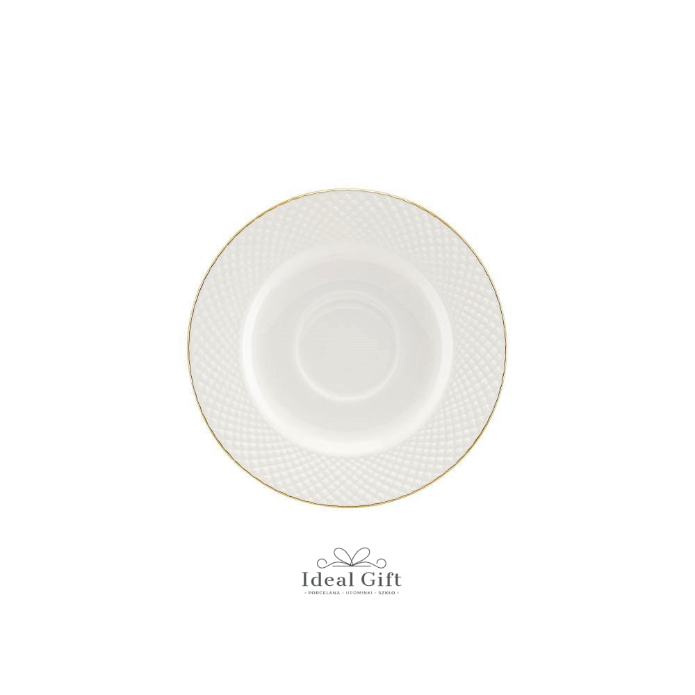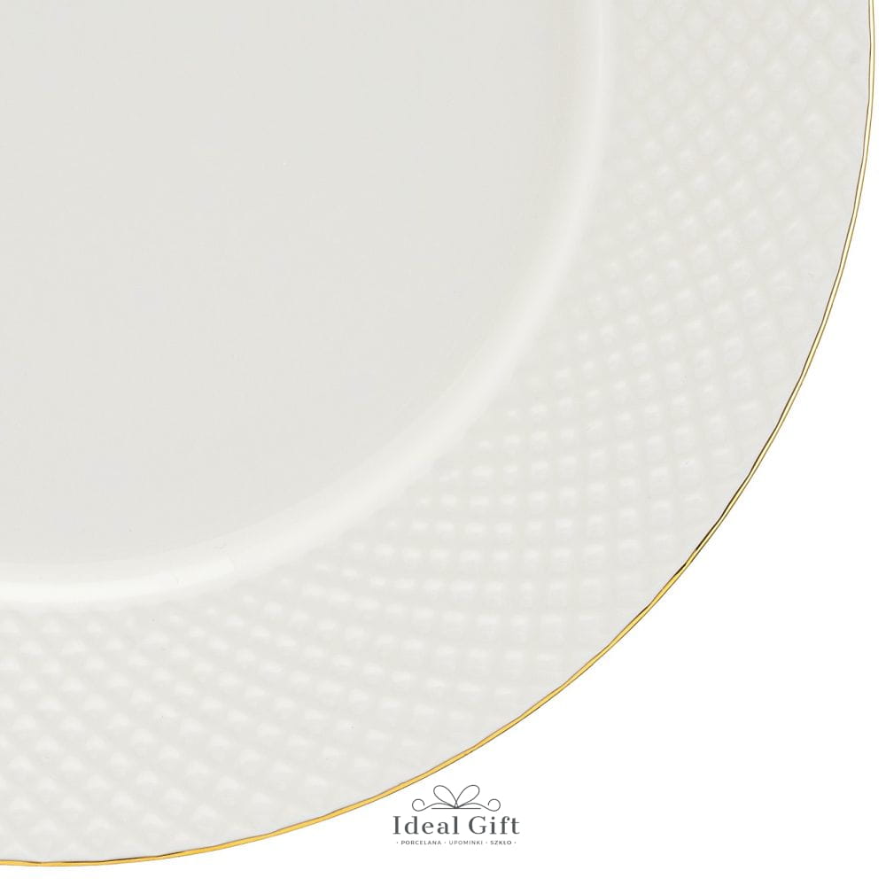 Bari Gold - Elegancka kolekcja wykonana z porcelany typu bone china - cienkiej, delikatnej, o pięknym mlecznym kolorze bieli. Naczynia są dekorowane wypukłym reliefem w formie bardzo drobnej kostki, a obrzeża zostały ręcznie wykończone złotą linią.