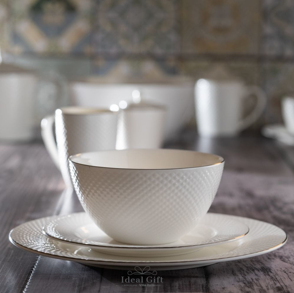 Serwis obiadowy z linii Bari Platin to niezwykle elegancka zastawa, wykonana z cienkiej i delikatnej porcelany kostnej. Charakteryzuje się ona ciepłym, mlecznym odcieniem bieli. Kolekcja zachwyca swoją prostą, ponadczasową formą, pełną lekkości. Komplet talerzy Bari Platin wyróżnia wyjątkowe zdobienie w postaci strukturalnego wzoru drobnej kostki i platynowych linii na obrzeżach. Talerze i cała zastawa Bari Platin świetnie sprawdzą się zarówno w klasycznych, jak i nowoczesnych wnętrzach. Każdemu spotkaniu przy wspólnym stole nadadzą wyjątkową oprawę.