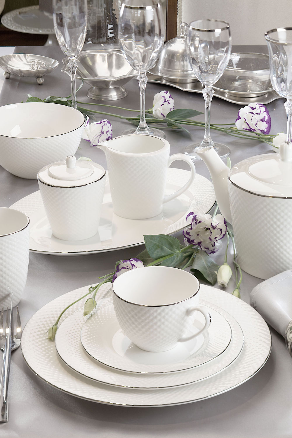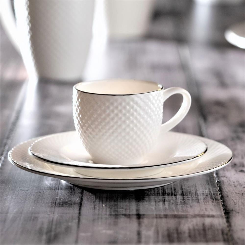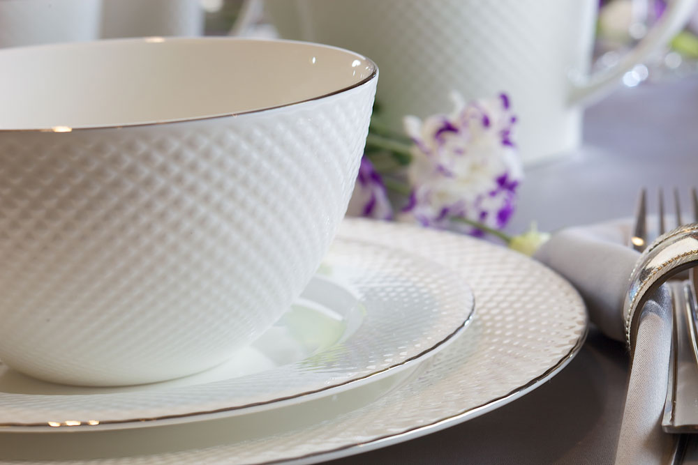 Bari Platin to niezwykle elegancka kolekcja, wykonana z cienkiej i delikatnej porcelany kostnej, w mlecznym odcieniu bieli. Kolekcja zachwyca ponadczasową formą, pełną lekkości i finezji. Serwis obiadowo-kawowy i pozostałe elementy kolekcji wyróżnia wyjątkowe zdobienie - strukturalny wzór na powierzchni naczyń. Platynowe linie na obrzeżach naczyń, malowane ręcznie, subtelnie podkreślają ich wyjątkowy charakter. Zastawa Bari Platin świetnie sprawdzi się zarówno w klasycznych jak i nowoczesnych wnętrzach, a każdemu spotkaniu przy wspólnym stole nada niezwykłą oprawę.