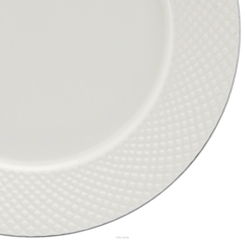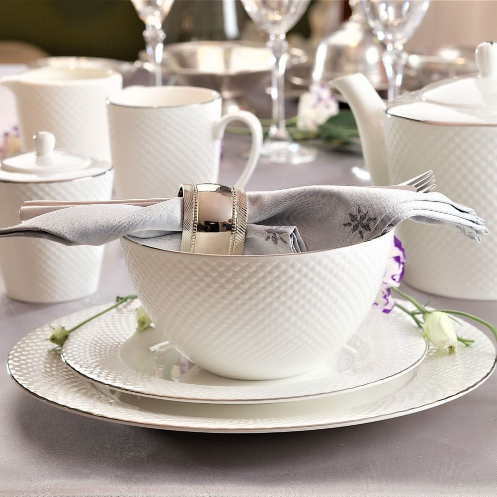 Bari Platin to elegancka kolekcja, wykonana z cienkiej i delikatnej porcelany kostnej o ciepłym, mlecznym odcieniu bieli. Kolekcja zachwyca klasyczną formą, pełną lekkości i finezji. Naczynia z linii Bari Platin wyróżnia zdobienie - strukturalny wzór w formie drobnej kostki. Malowane ręcznie, platynowe linie na obrzeżach, subtelnie podkreślają wyjątkowy charakter naczyń. Elegancki serwis obiadowy doskonale sprawdzi się podczas specjalnych okazji. Zastawa będzie prezentowała się doskonale zarówno w klasycznych jak i nowoczesnych wnętrzach. Wzór i zdobienie efektownie odbijają światło, dzięki czemu Twój stół nabierze blasku, a przyjęcie zyska wspaniałą oprawę.