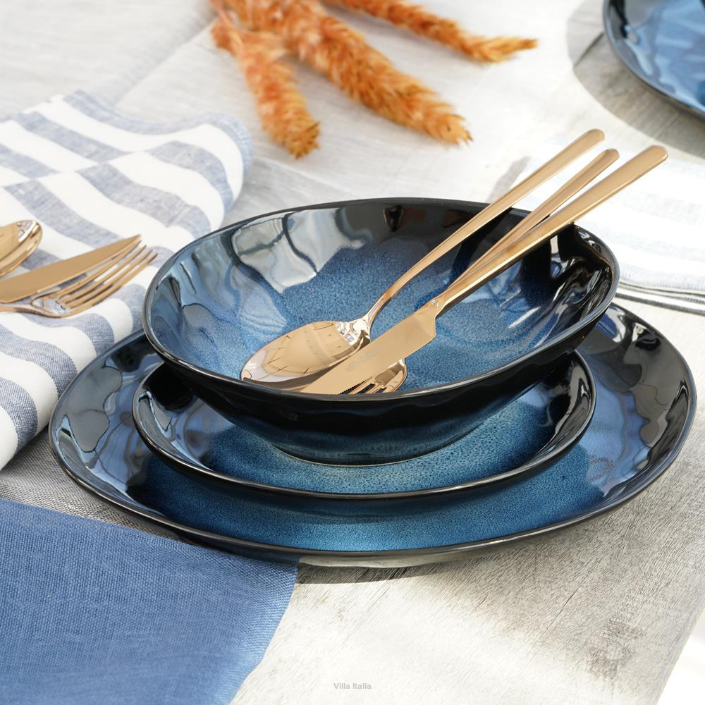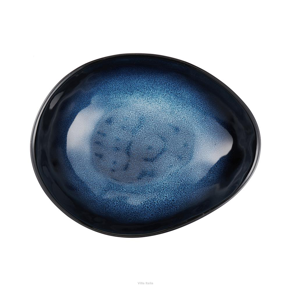 Talerz głęboki z kolekcji wysokiej jakości naczyń kamionkowych Dark Night. Linię charakteryzują nieregularne kształty talerzy i zdobienia reaktywnym szkliwem, tworzącym na jej elementach niepowtarzalne wzory. Naczynia barwione są na czarno i pokryte jednostronnie szkliwem w odcieniach niebieskiego. Ich wykończenie jest gładkie i błyszczące, co podkreśla głębię kolorów. Zestawione ze sobą naczynia z kolekcji Dark Night stworzą niezwykłą kompozycję na stole, która będzie piękną oprawą wyjątkowych dań.