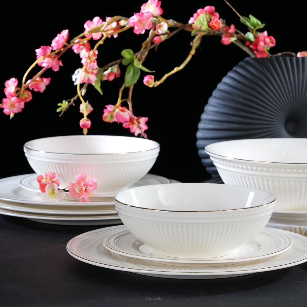 Zestaw obiadowy na 6 osób z serii EUNICE. To porcelana typu NBC, dekorowana ręcznie złotem. Kolekcję wyróżniają reliefowe wzory na rantach i ściankach naczyń. Wklęsłe prążki, wypukłe kropki i linie nadają naczyniom niezwykłą fakturę i głębię. Kształty naczyń podkreślają cienkie złote linie na obrzeżach. Strukturalny wzór wraz ze złoceniami i błyszczącym szkliwem tworzy unikalną kompozycję na stole.