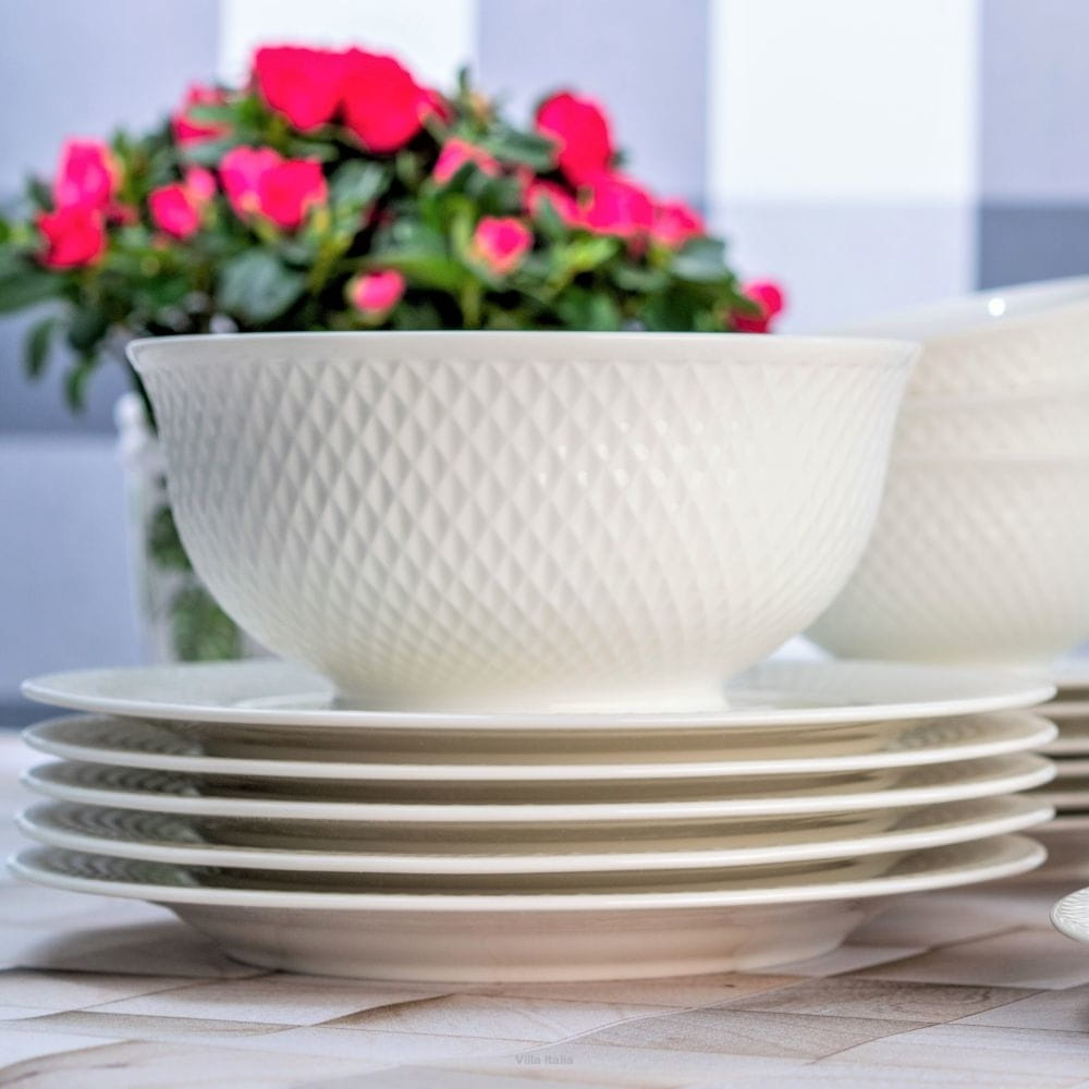 Prosta a równocześnie elegancka salaterka z kolekcji ceramiki w delikatnym, mlecznym odcieniu. Misa oraz pozostałe elementy kolekcji wyróżniają się klasyczną, okrągła formą, która decyduje o jego ponadczasowości. Ciekawym elementem zdobiącym naczynia jest delikatny relief w formie kratki na całej powierzchni naczyń oraz brzegach talerzy i półmisków. Kolekcja nabiera lekkości i finezji dzięki stylowym stopkom naczyń (salaterki, kubka, filiżanki, czajnika, mlecznika, cukiernicy).