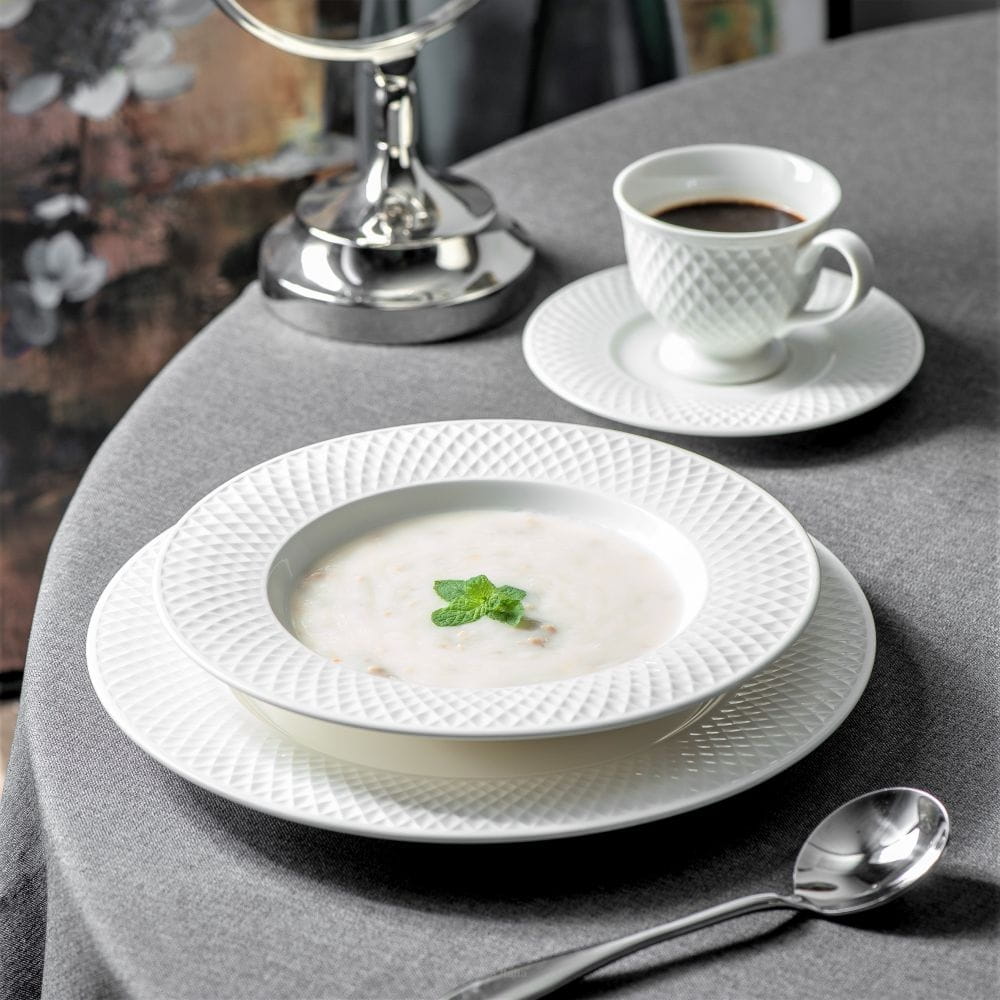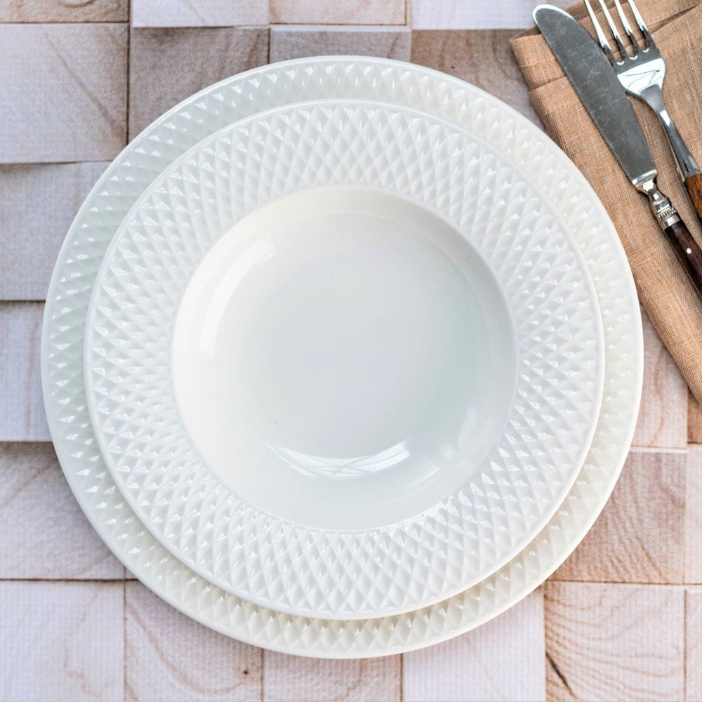 Prosty a równocześnie elegancki talerz z kolekcji ceramiki w delikatnym, mlecznym odcieniu. Talerze i pozostałe elementy kolekcji wyróżniają się klasyczną, okrągła formą, która decyduje o jego ponadczasowości. Ciekawym elementem zdobiącym naczynia jest delikatny relief w formie kratki na całej powierzchni naczyń oraz brzegach talerzy i półmisków. Kolekcja nabiera lekkości i finezji dzięki stylowym stopkom naczyń (salaterki, kubka, filiżanki, czajnika, mlecznika, cukiernicy).