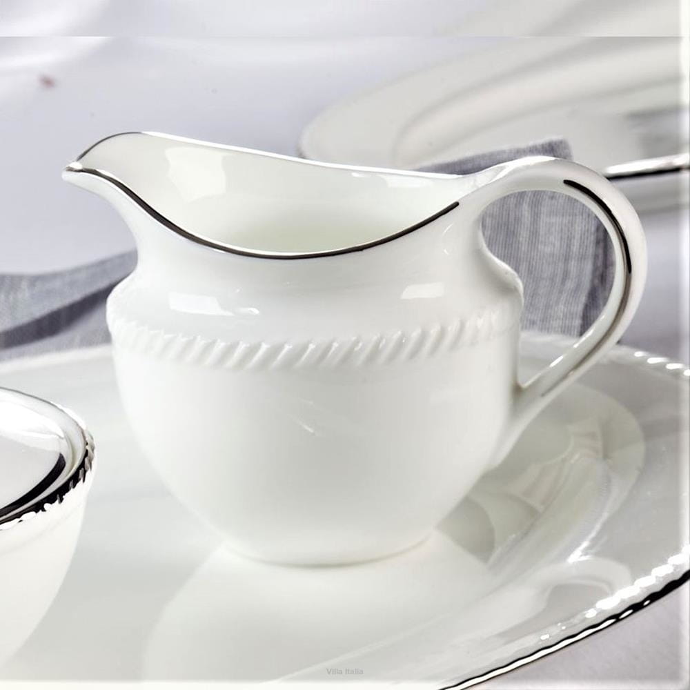 Piękny mlecznik, pochodzi z kolekcji Florian - najwyższej jakości cienkiej, delikatnej porcelany kostnej. W jej skład wchodzą naczynia w przepięknym, mlecznym kolorze, zdobione ręcznie dość grubą linią platyny na karbowanych obrzeżach. Linia Florian zaprojektowana została dla osób ceniących prostą elegancję oraz komfort użytkowania. Okrągły fason i delikatne zdobienie sprawiają, że kolekcja świetnie komponuje się zarówno z klasyczną aranżacją stołu, jak i ultranowoczesną. Duże talerze oraz pojemne filiżanki i kubki z wygodnymi uchwytami są bardzo praktyczne. Zastawa została stworzona z myślą o samodzielnej kompletacji - większość pozycji można kupić pojedynczo, tworząc dowolne zestawy według indywidualnych potrzeb. Wszystkie naczynia z tej serii można bezpiecznie myć w zmywarce.
