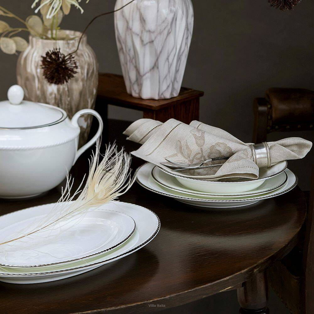 Duży półmisek owalny o długości 36 cm, pochodzi z kolekcji Florian - najwyższej jakości cienkiej, delikatnej porcelany kostnej. W jej skład wchodzą naczynia w przepięknym, mlecznym kolorze, zdobione ręcznie dość grubą linią platyny na karbowanych obrzeżach.
