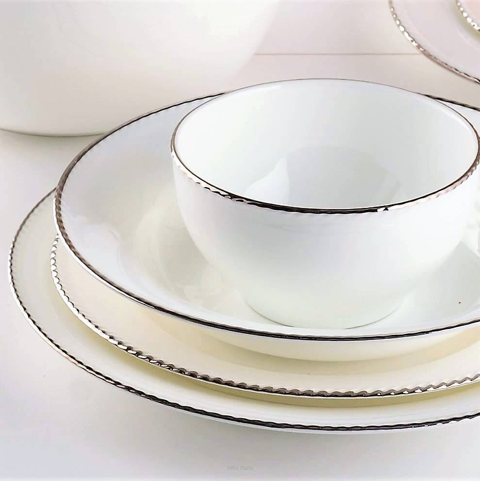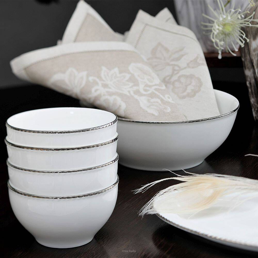 Miseczka, mała salaterka o średnicy 13 cm, pochodzi z kolekcji Florian - najwyższej jakości cienkiej, delikatnej porcelany kostnej. W jej skład wchodzą naczynia w przepięknym, mlecznym kolorze, zdobione ręcznie dość grubą linią platyny na karbowanych obrzeżach.
