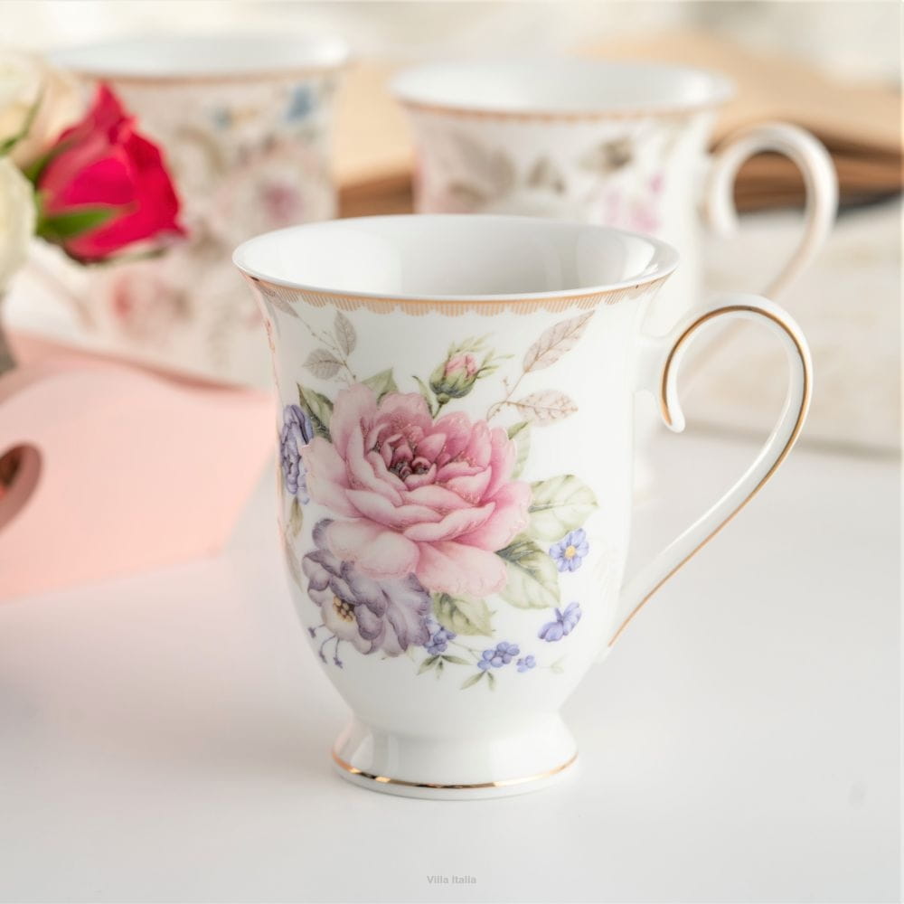 Przepiękny kubek KATE wykony jest z bardzo cienkiej i delikatnej porcelany w odcieniu mlecznej bieli. Niezwykle lekki, dekorowany motywem kwiatowym kubek będzie elegancką ozdobą każdego stołu. Na każdej ze stron kubka umieszczono nieco inny motyw dekoracyjny. Klasyczny charakter kubka podkreślają ręcznie malowane złote linie na obrzeżu, stopce i uchwycie. W kolekcji dostępne również kubki i filiżanki z innym motywem kwiatowym.