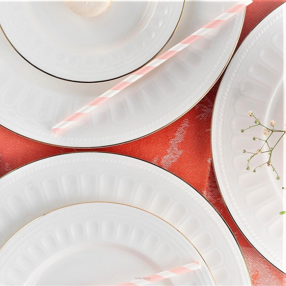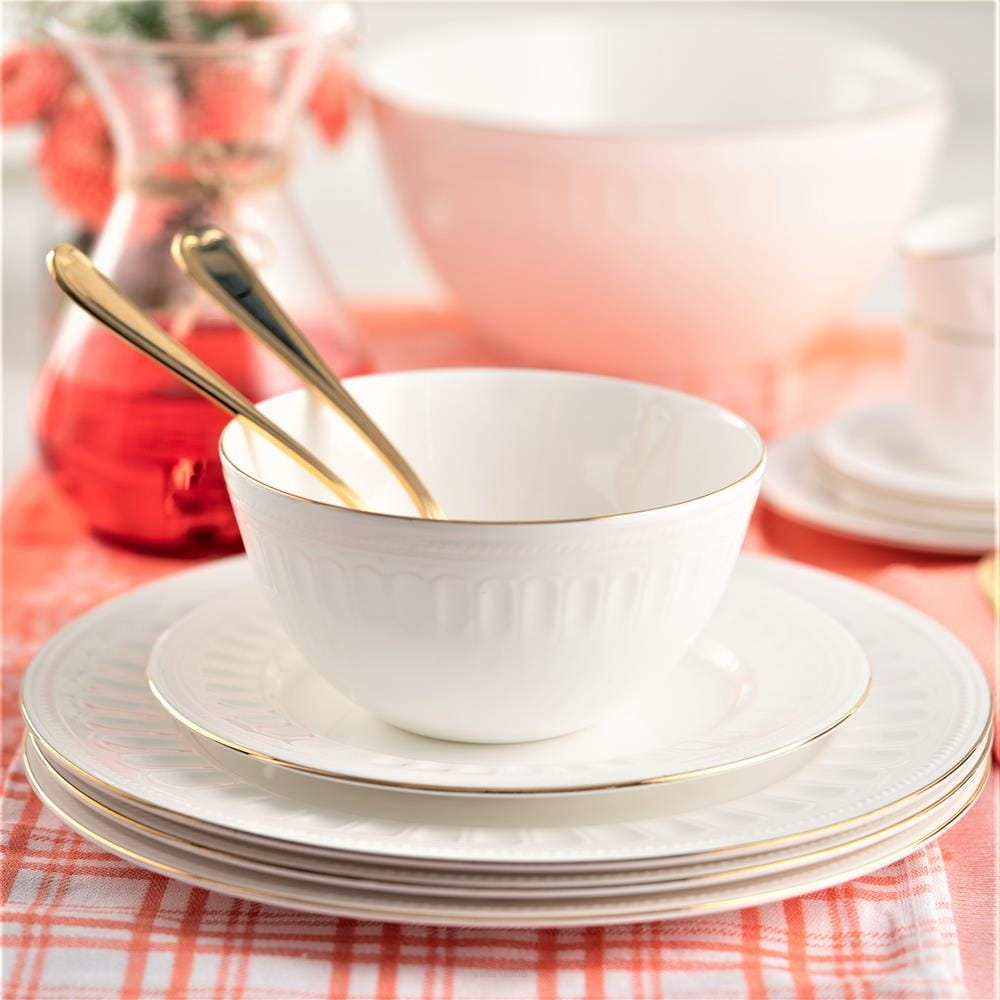 Elegancka zastawa stołowa z kolekcji Mesyna Gold. Wykonana z cienkiej i delikatnej porcelany kostnej o ciepłym, mlecznym odcieniu bieli. Zachwyca klasyczną formą, pełną lekkości i finezji. Serwis obiadowy wyróżnia zdobienie - delikatne wgłębienia i linie, które nawiązują do antycznej, klasycznej stylistyki. Malowane ręcznie złote linie na obrzeżach naczyń subtelnie podkreślają ich wyjątkowy charakter. Serwis porcelanowy Mesyna Gold świetnie sprawdzi się w klasycznych wnętrzach, a każdemu spotkaniu przy stole nada niezwykłą oprawę.