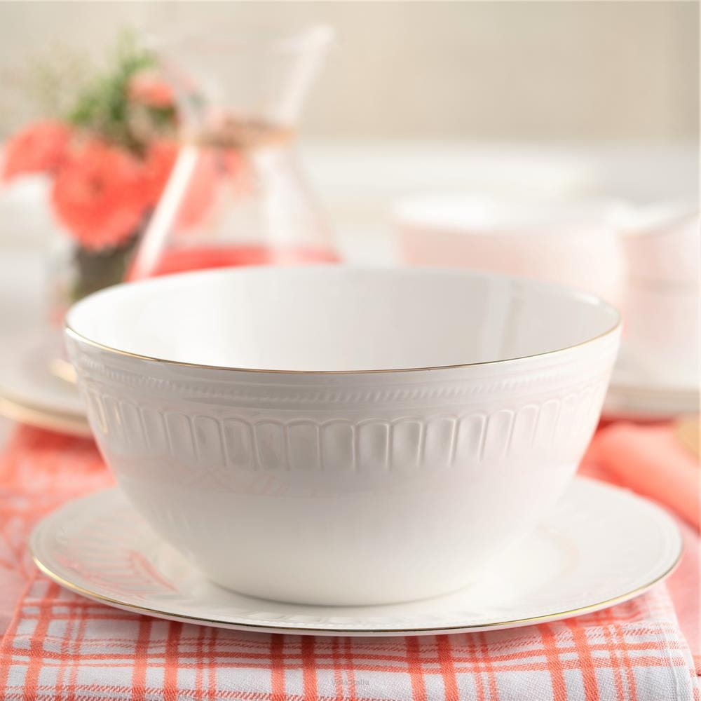 Mesyna Gold to niezwykle elegancka kolekcja wykonana z cienkiej i delikatnej porcelany kostnej w mlecznym odcieniu bieli. Zachwyca swą klasyczną formą, pełną lekkości i finezji. Misę i pozostałe elementy kolekcji wyróżnia zdobienie - delikatne wgłębienia i linie na obrzeżu, które nawiązują do antycznej, klasycznej stylistyki. Złota linia na obrzeżu, malowana ręcznie, subtelnie podkreśla jej wyjątkowy charakter. Salaterka i cała zastawa Mesyna Gold świetnie sprawdzi się w klasycznych wnętrzach, a każdemu spotkaniu przy stole nada niezwykłą oprawę.