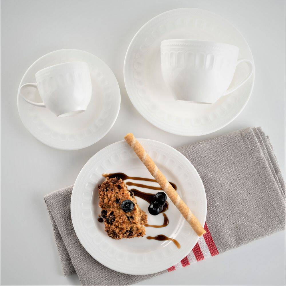 Mesyna White to elegancka kolekcja, wykonana z cienkiej i delikatnej porcelany kostnej, w ciepłym, mlecznym odcieniu bieli. Zachwyca swoją klasyczną formą, pełną lekkości i finezji. Poszczególne elementy kolekcji mają delikatne wgłębienia, nawiązujące do antycznej, klasycznej stylistyki. Zastawa Mesyna White świetnie sprawdzi się w klasycznych wnętrzach, a każdemu spotkaniu przy wspólnym stole nada niezwykłą oprawę.