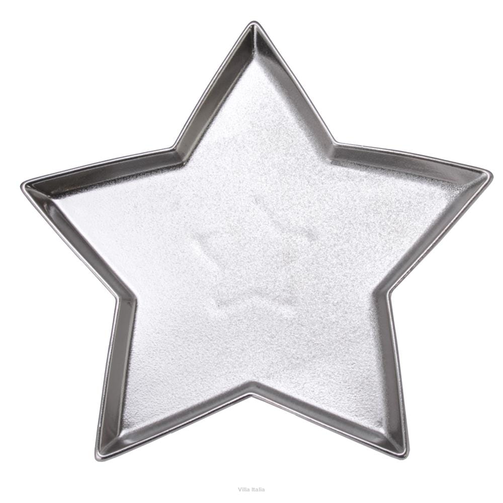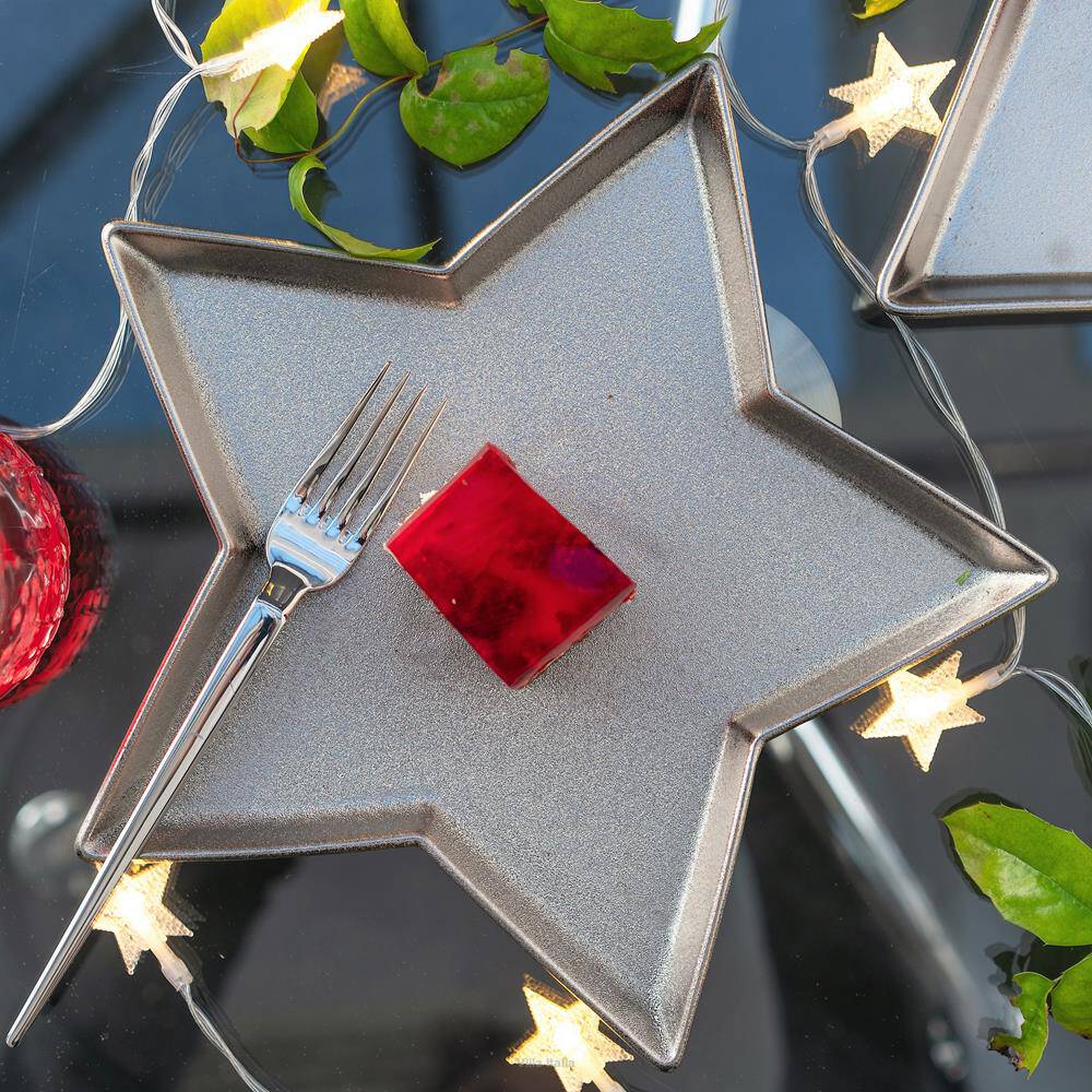 Nietuzinkowy talerz - gwiazda, wykonany z ceramiki i malowany w srebrnym kolorze z matowym wykończeniem. Talerz ma 26 cm i jest odpowiedni do kontaktu z żywnością, dzięki czemu można podawać na nim np. słodycze lub słone przekąski. Można również używać go jako podstawki, na przykład pod doniczkę. Srebrny talerz w kształcie gwiazdy jest efektowną i oryginalną dekoracją stołu, która wzbogaci wiele aranżacji. Jest idealny na Wigilię, sylwestrową kolację lub noworoczny obiad.