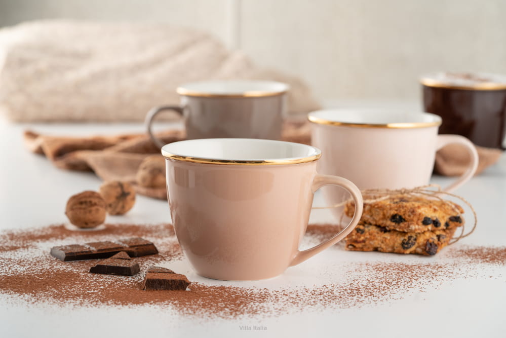 Duża filiżanka porcelanowa, ręcznie formowana i zdobiona. Pojemna filiżanka jumbo mieszcząca nawet ponad pół litra, jest idealna do herbaty, kawy, ziół, czy kakao. Filiżanka / kubek posiada duży, bardzo wygodny uchwyt. Wykonana jest z porcelany w mlecznym odcieniu. Na zewnątrz pomalowana jest na szarobrązowy kolor, przypominający mielony pieprz. Lekko wypukłe obrzeże kubka zdobi 4-milimetrowy, złoty pasek.