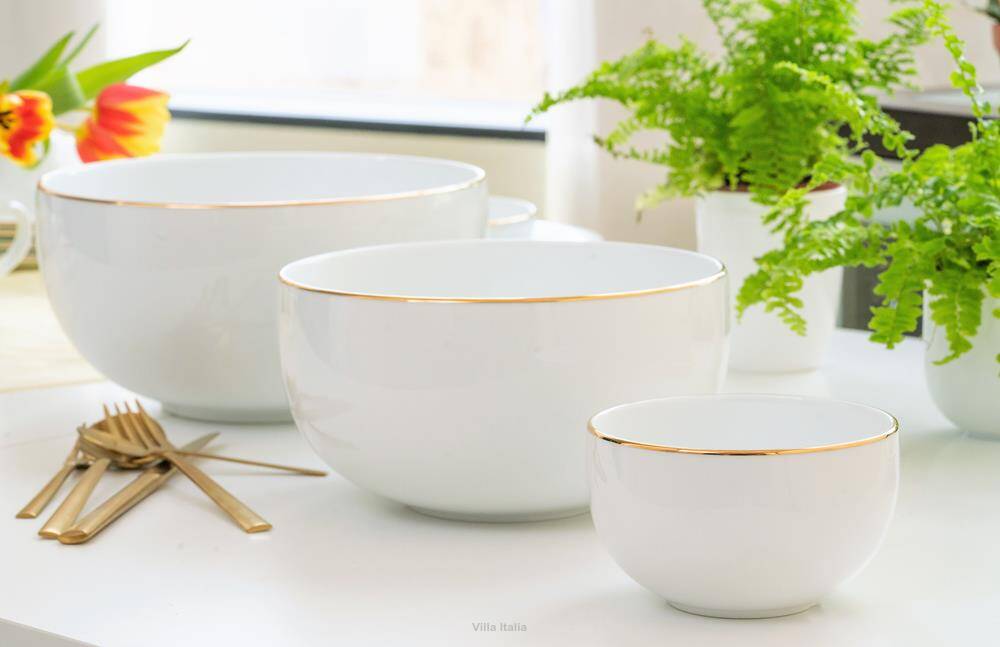Salaterka PLUS Gold ma prostą formę i subtelne złote zdobienie, co sprawia, że pasuje do wielu zastaw stołowych. Kolekcja dostępna jest na sztuki, dzięki czemu jej elementy można dowolnie łączyć.