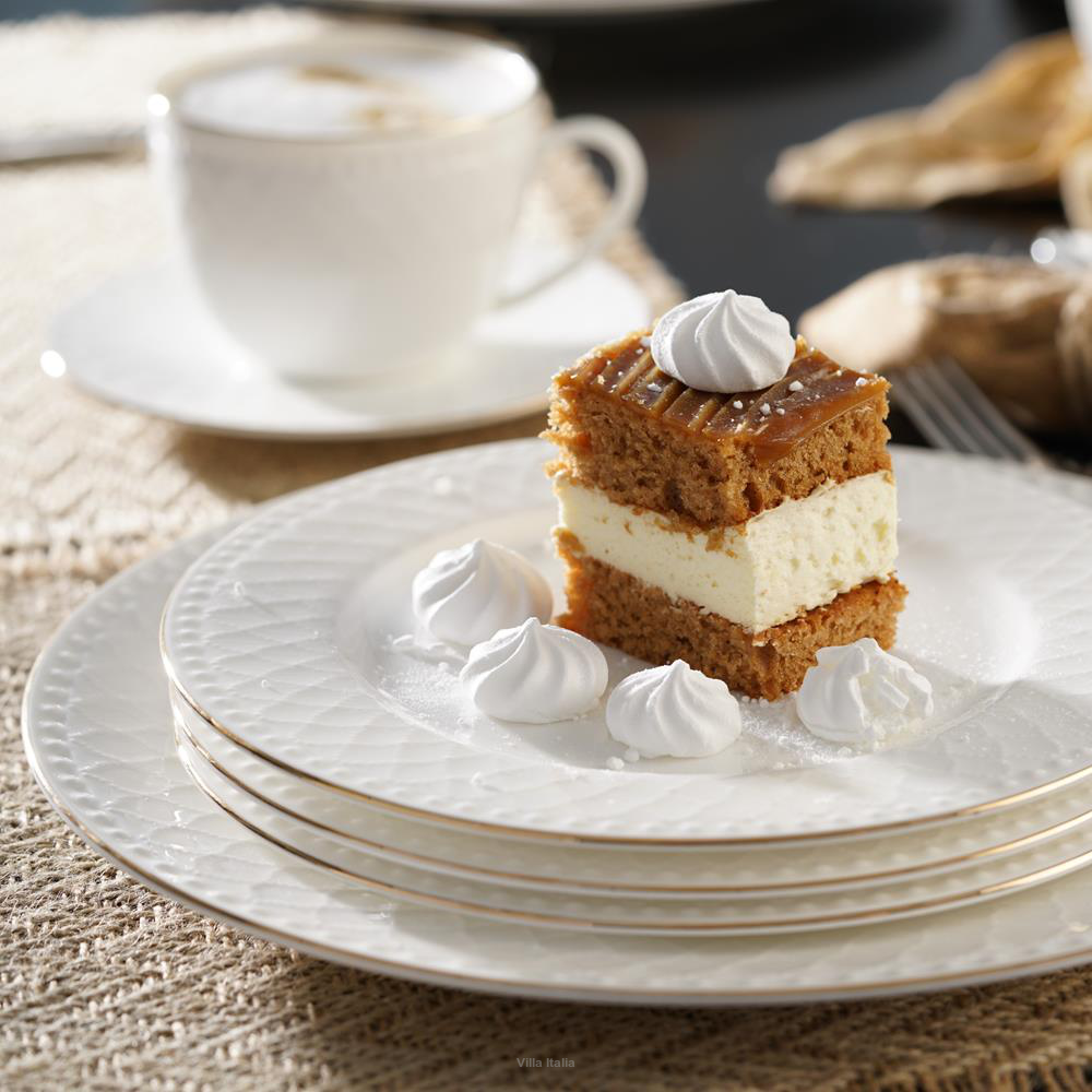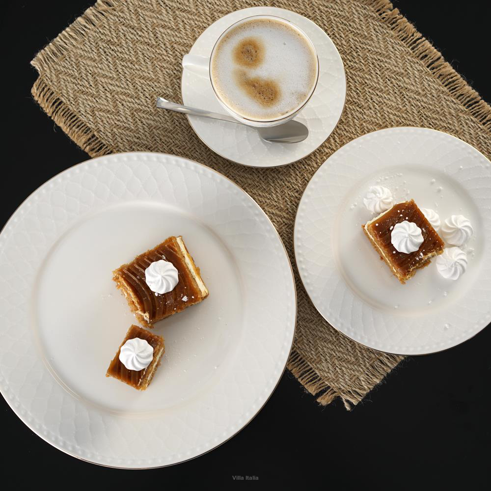 Filiżanki porcelanowe wykonane z wysokiej klasy porcelany kostnej o mlecznym odcieniu bieli. Kolekcję Roma Gold wyróżnia delikatny, lekko wypukły wzór koronki oraz złota obwódka, malowana ręcznie na obrzeżach.
