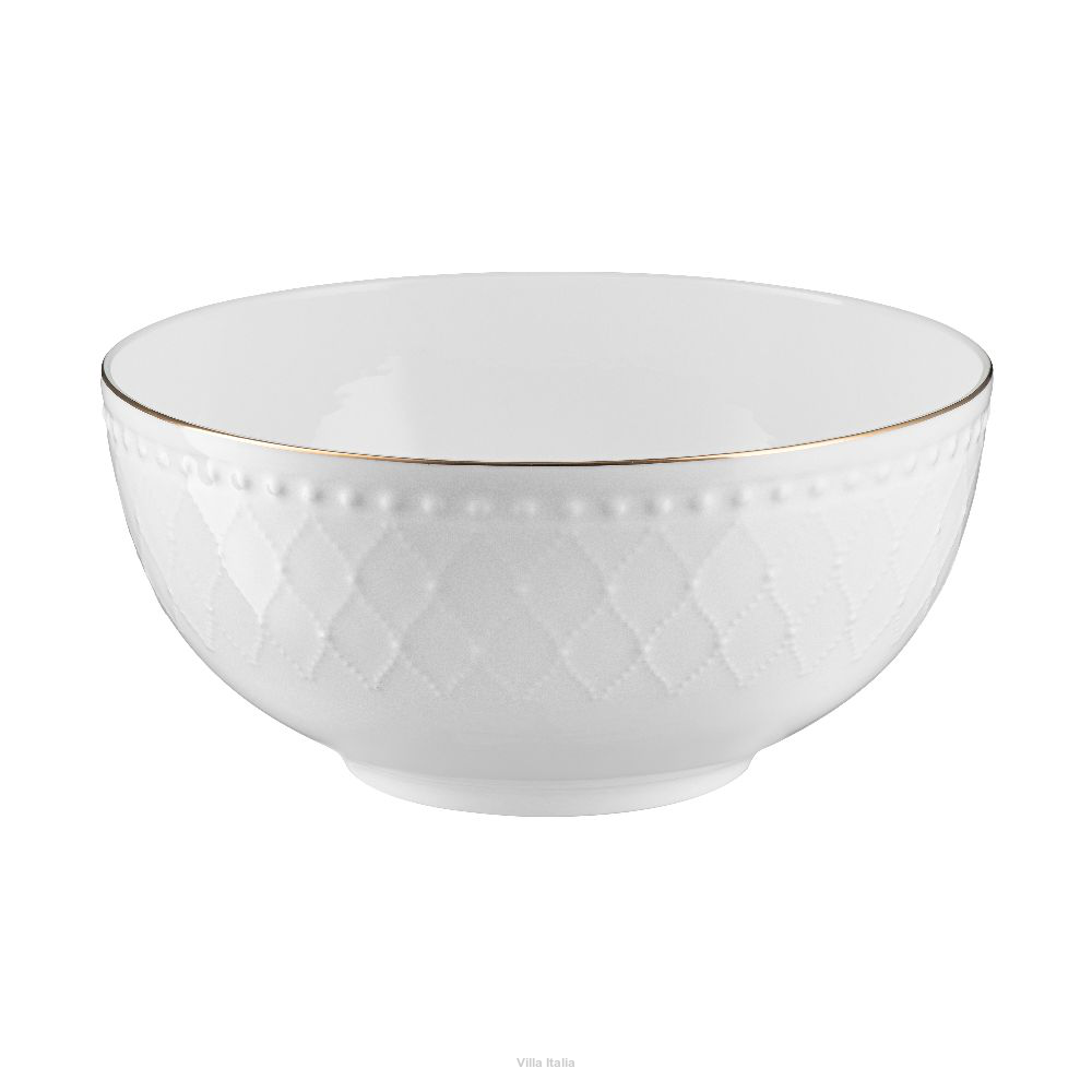 Miseczka lub salaterka o średnicy 16 cm z kolekcji Roma Gold. Wykonana z wysokiej klasy porcelany kostnej o mlecznym odcieniu bieli. Naczynia wyróżnia delikatny wzór koronki oraz ręcznie malowana, złota obwódka.