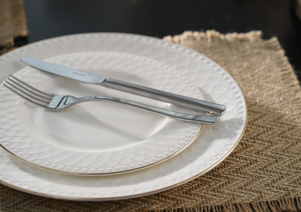 Talerz obiadowy z kolekcji Roma Gold. Wykonany z wysokiej klasy porcelany kostnej o mlecznym odcieniu bieli. Kolekcję Roma Gold wyróżnia delikatny wzór koronki oraz złote obwódki, malowane ręcznie na obrzeżach naczyń.