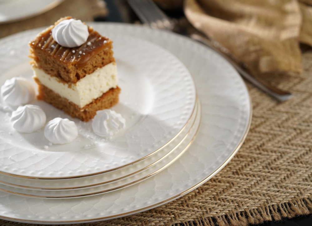 Talerzyk deserowy lub śniadaniowy z kolekcji Roma Gold. Roma to wysokiej klasy porcelana kostna o mlecznym odcieniu bieli. Naczynia wyróżnia wzór delikatnej koronki oraz ręcznie malowana obwódka. Talerzyki deserowe Roma Gold zdobione są złotem na obrzeżach.