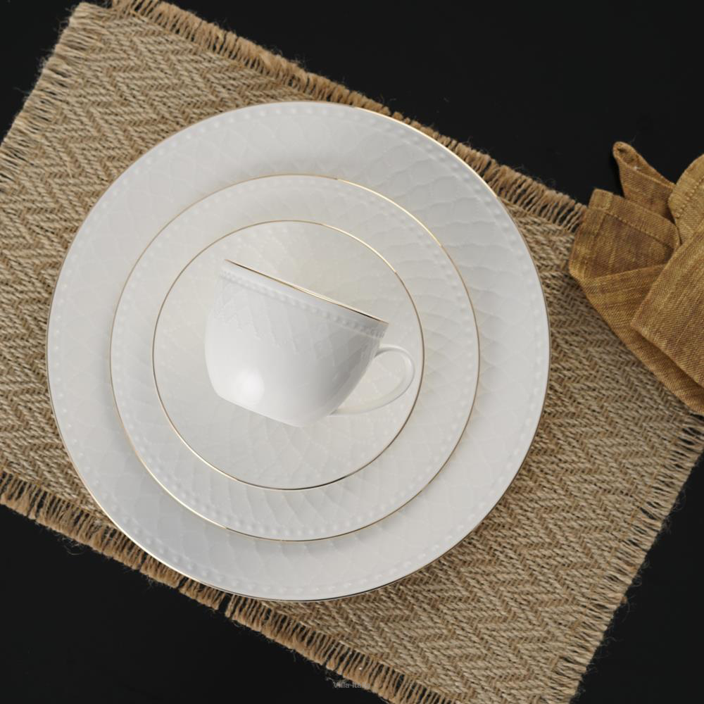 Zestaw do kawy i herbaty Roma Gold to wysokiej klasy porcelana kostna, charakteryzująca się mlecznym odcieniem bieli. Naczynia wyróżnia wzór w formie delikatnej koronki lub kratki oraz złote obwódki, malowane ręcznie na obrzeżach.