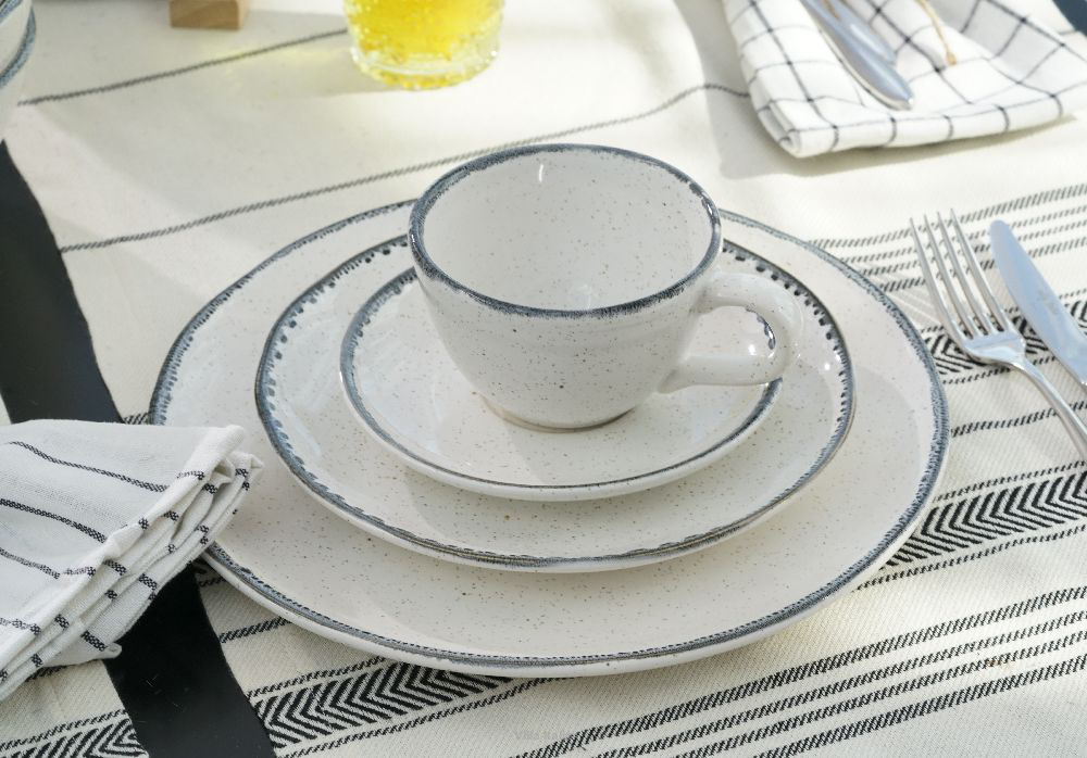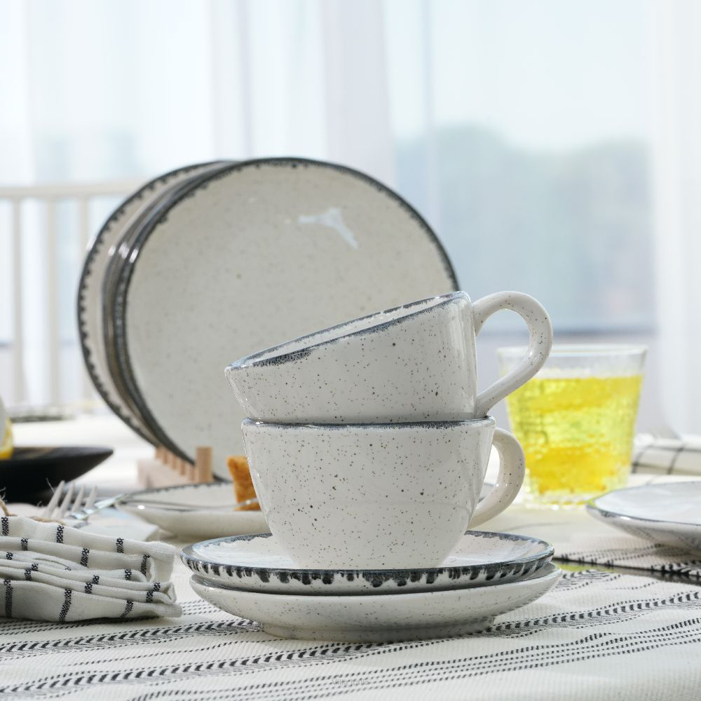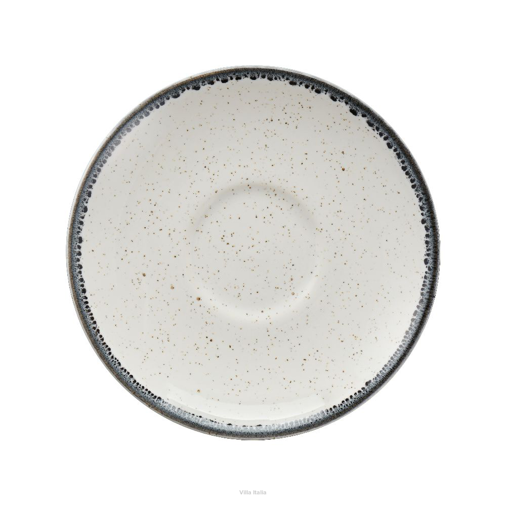 Filiżanka do kawy lub herbaty z kolekcji Vanilla. Linia ta przypadnie do gustu miłośnikom wyrobów rzemieślniczych. Talerze mają delikatnie nierówne powierzchnie i krawędzie, co nadaje im naturalny i oryginalny wygląd. Naczynia w ciepłym odcieniu bieli zdobią nieregularne, czarno-szare obwódki oraz drobne, beżowe i czarne kropki.