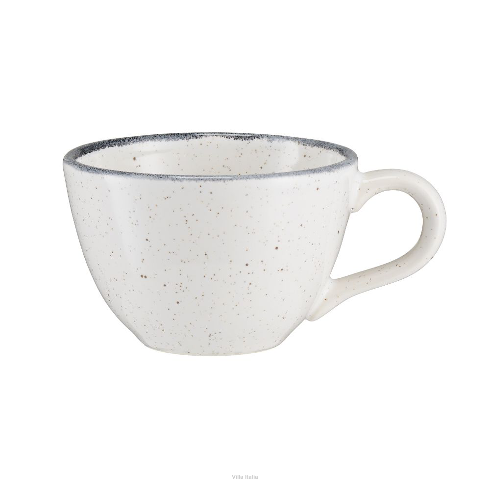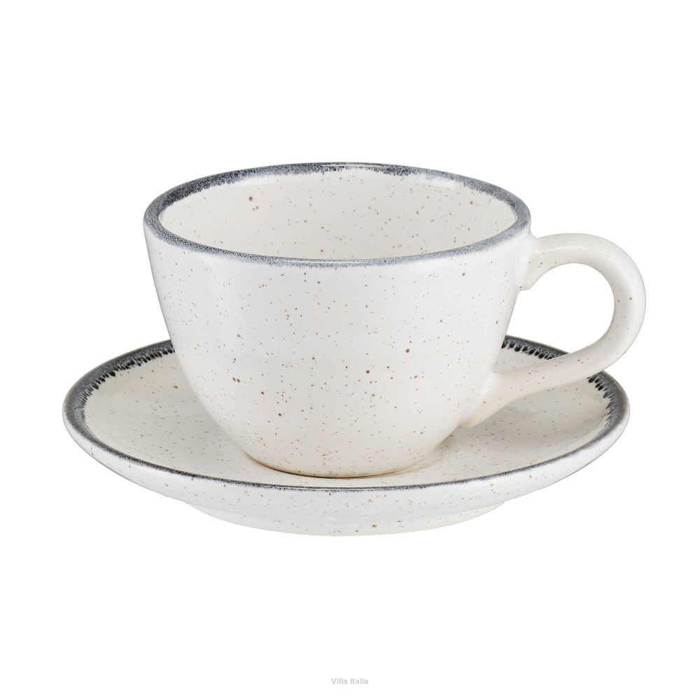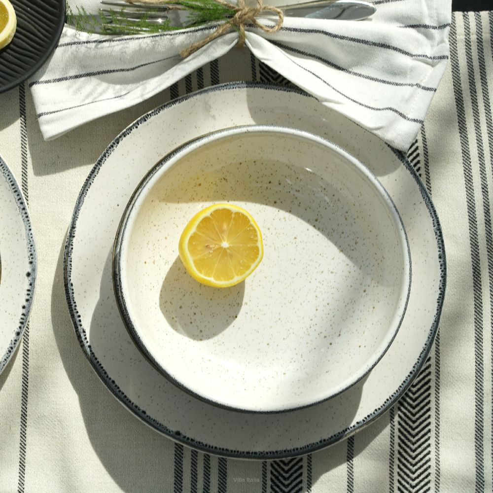Zastawa ceramiczna Vanilla przypadnie do gustu miłośnikom wyrobów rzemieślniczych. Naczynia mają delikatnie nierówne powierzchnie i krawędzie, co nadaje im naturalny i oryginalny wygląd. Serwis obiadowo-kawowy Vanilla w ciepłym odcieniu bieli zdobi reaktywne szkliwo. Wszystkie elementy charakteryzują nieregularne, czarno-szare obwódki oraz drobne, beżowe i czarne kropki.