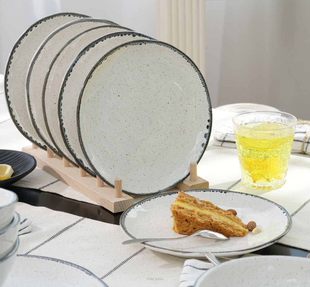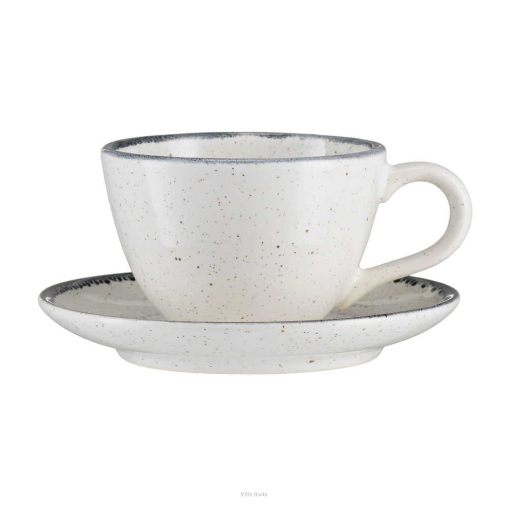Zestaw kawowy z kolekcji Vanilla, która przypadnie do gustu miłośnikom wyrobów rzemieślniczych. Talerze mają delikatnie nierówne powierzchnie i krawędzie, co nadaje im naturalny i oryginalny wygląd. Naczynia w ciepłym odcieniu bieli zdobi reaktywne szkliwo. Charakteryzują je nieregularne, czarno-szare obwódki oraz drobne, beżowe i czarne kropki.