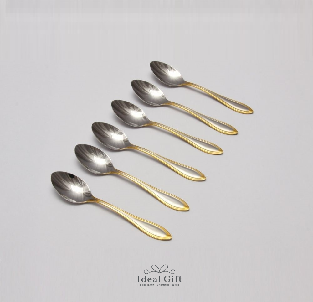 Kolekcja klasycznych, bardzo eleganckich uroczych łyżeczek do espresso wykonanych z najwyższej jakości stali nierdzewnej typu 18/10, o pięknym połysku. Satynowane uchwyty oraz obrzeża wykończone cienką linią złota stanowią o unikatowości tej kolekcji. Doskonałe na eleganckie przyjęcia. Świetnie sprawdzą się także podczas spotkania przy kawie i deserze.