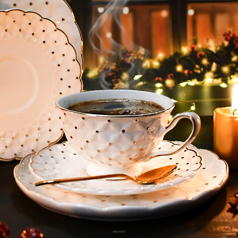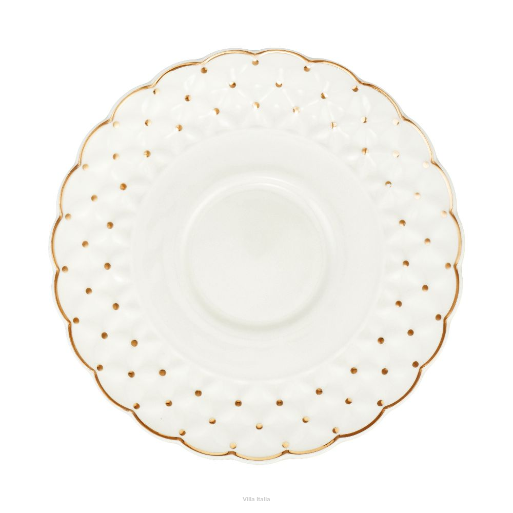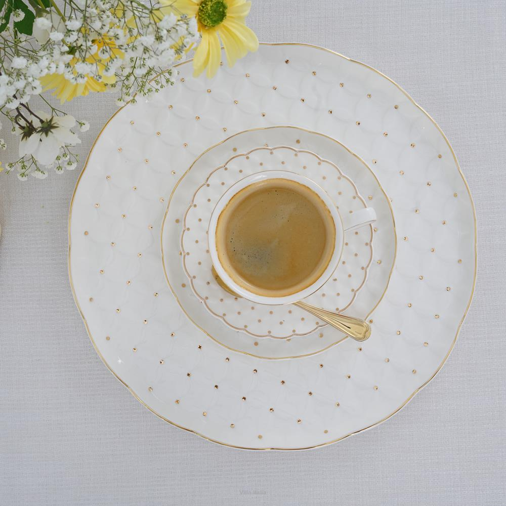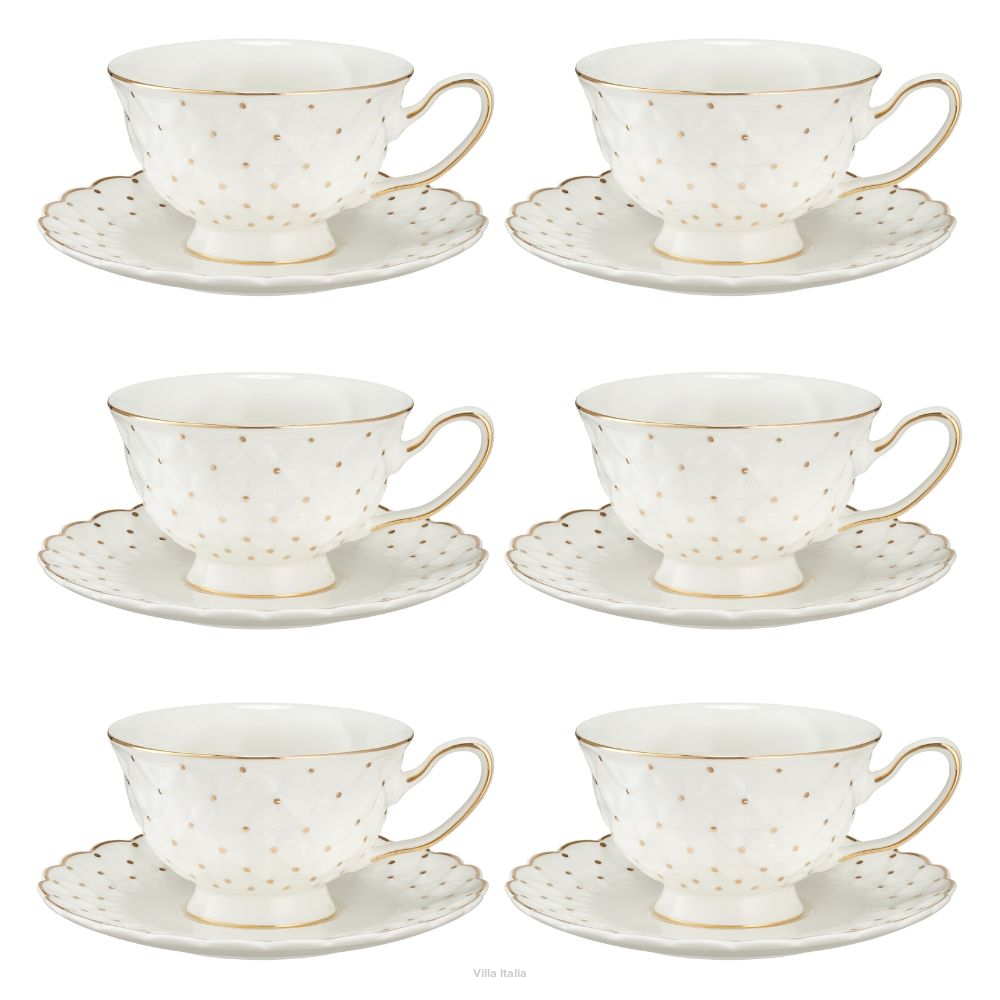 Szykowne filiżanki do herbaty wykonane z porcelany typu NBC w mlecznym odcieniu bieli. Filiżanki i spodki zdobi wypukły wzór dekorowany złotymi kropeczkami. Uroku i klasycznego charakteru dodają im przyciągające uwagę spodeczki, a luksusowego sznytu - obrzeża malowane ręcznie złotem.