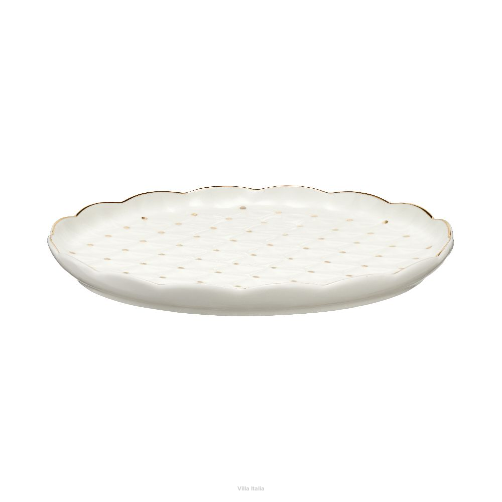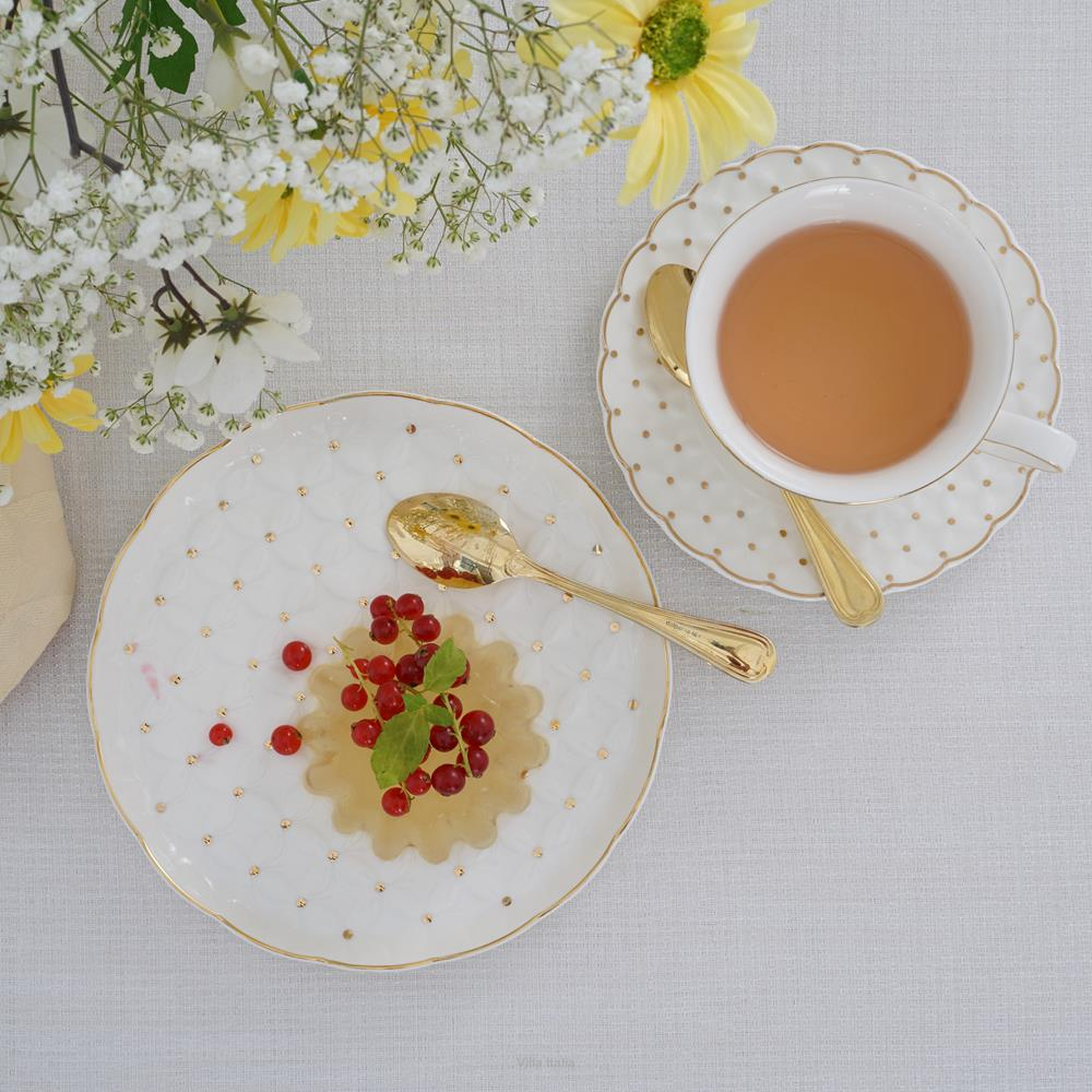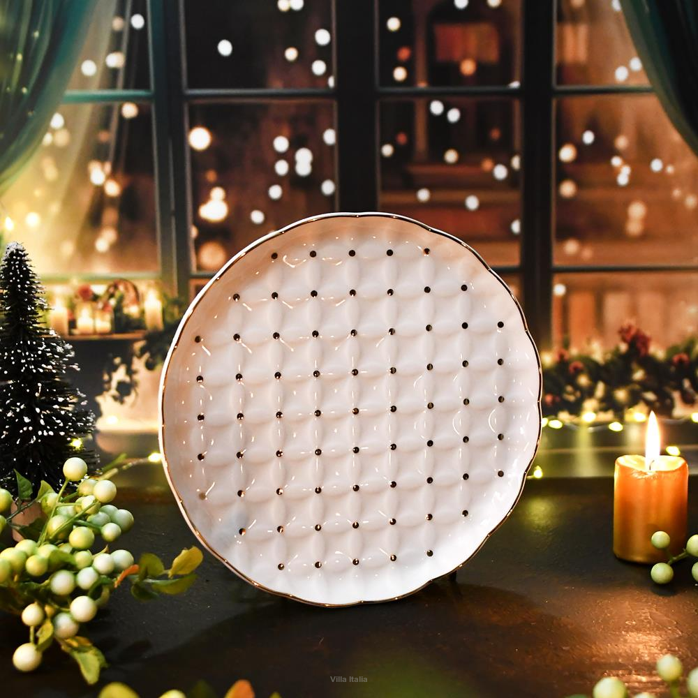 Szykowny talerzyk deserowy wykonany z porcelany typu NBC w mlecznym odcieniu bieli. Całą powierzchnię talerzyka zdobi wzór reliefowy dekorowany złotymi kropeczkami. Uroku dodaje mu rant malowany ręcznie złotem.