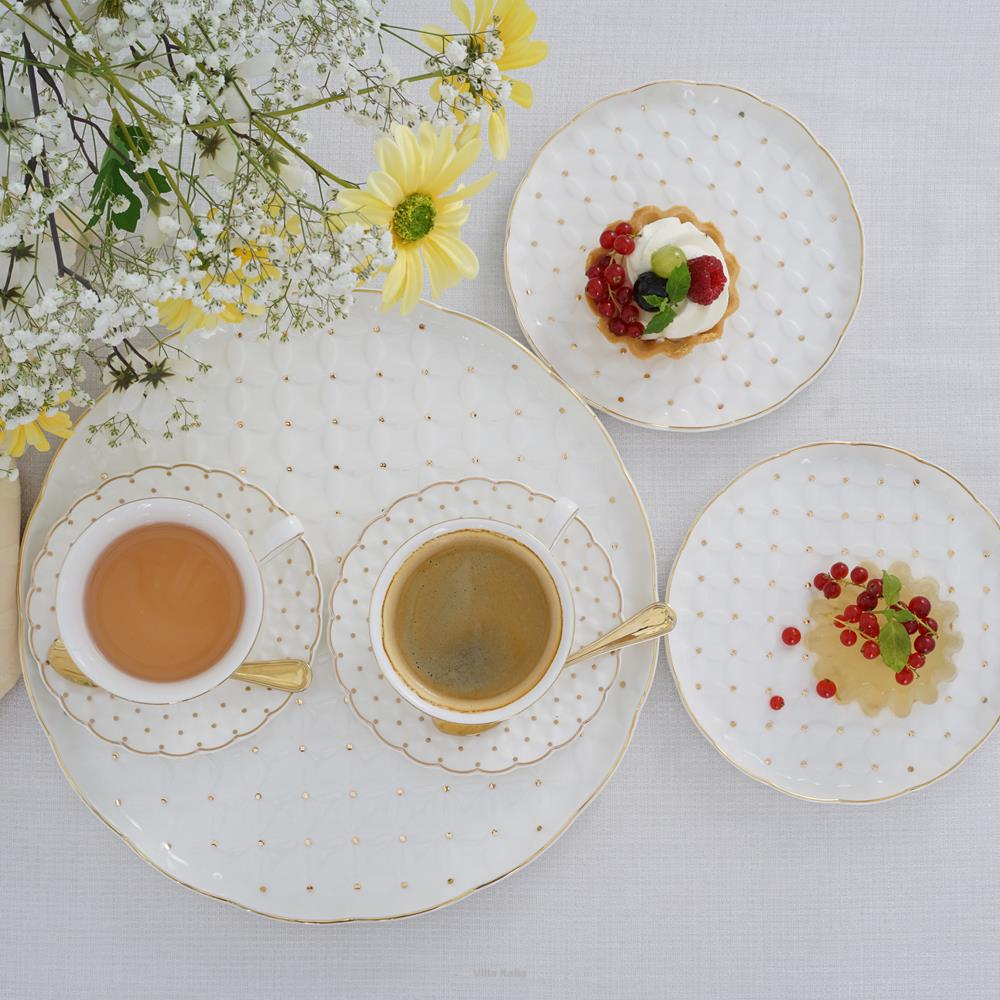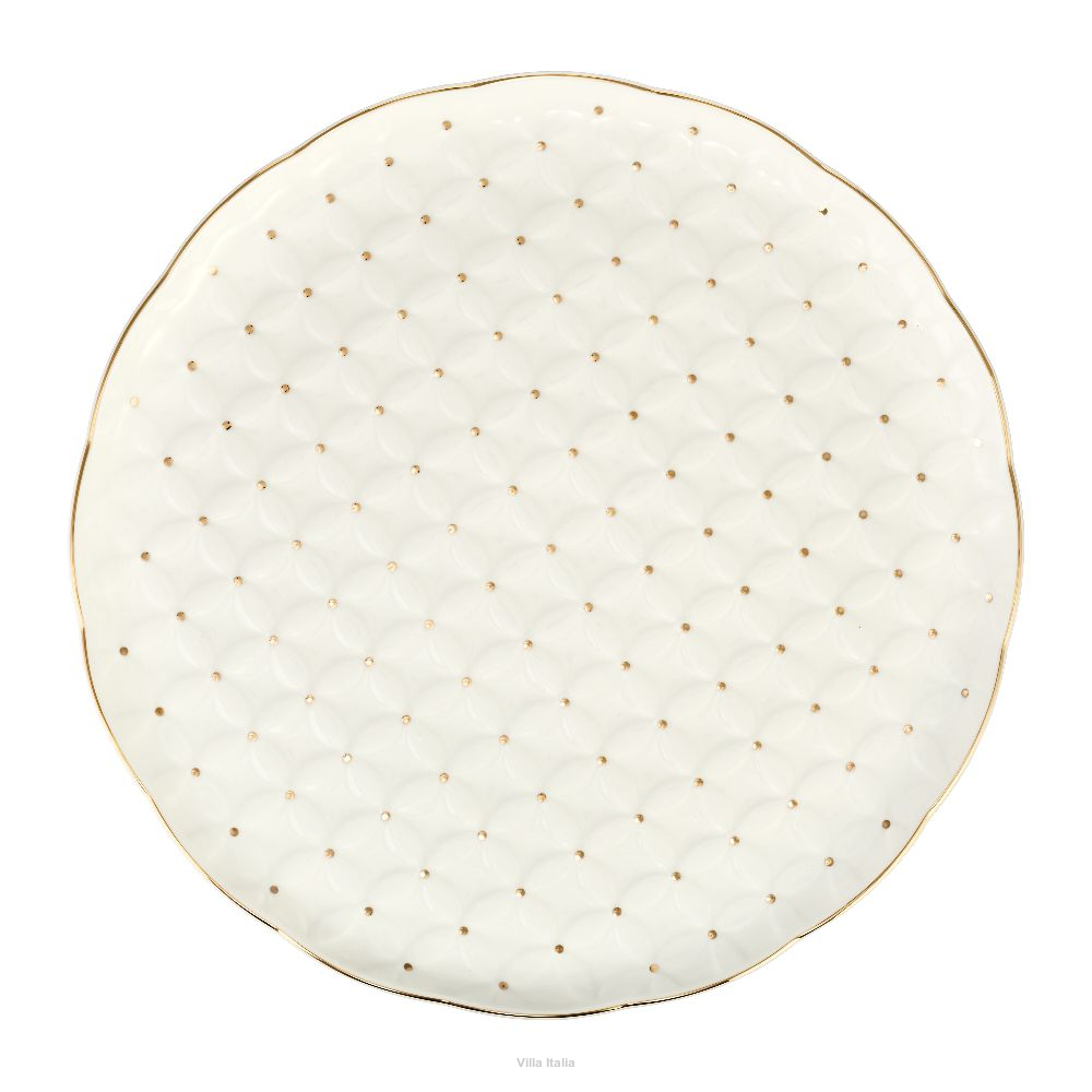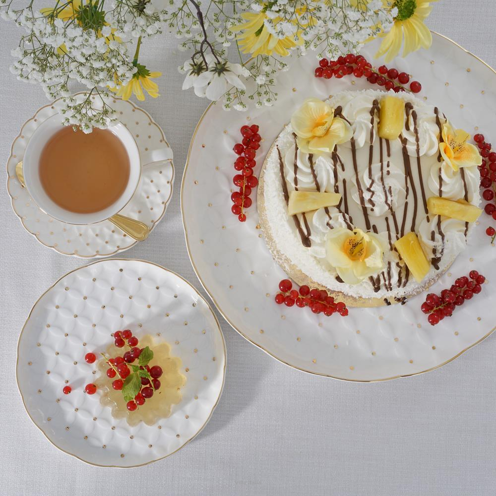 Elegancka zastawa do ciasta, wykonana z porcelany typu NBC w mlecznym odcieniu bieli. Naczynia zdobi wzór reliefowy dekorowany złotymi kropeczkami. Uroku elegancji dodaje talerzom deserowym kształt i wykończenie rantów. Obrzeża talerzy malowane są ręcznie złotem.