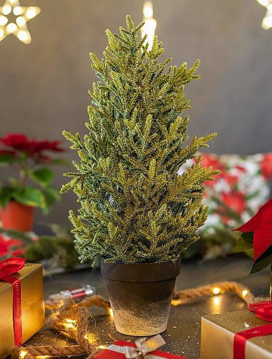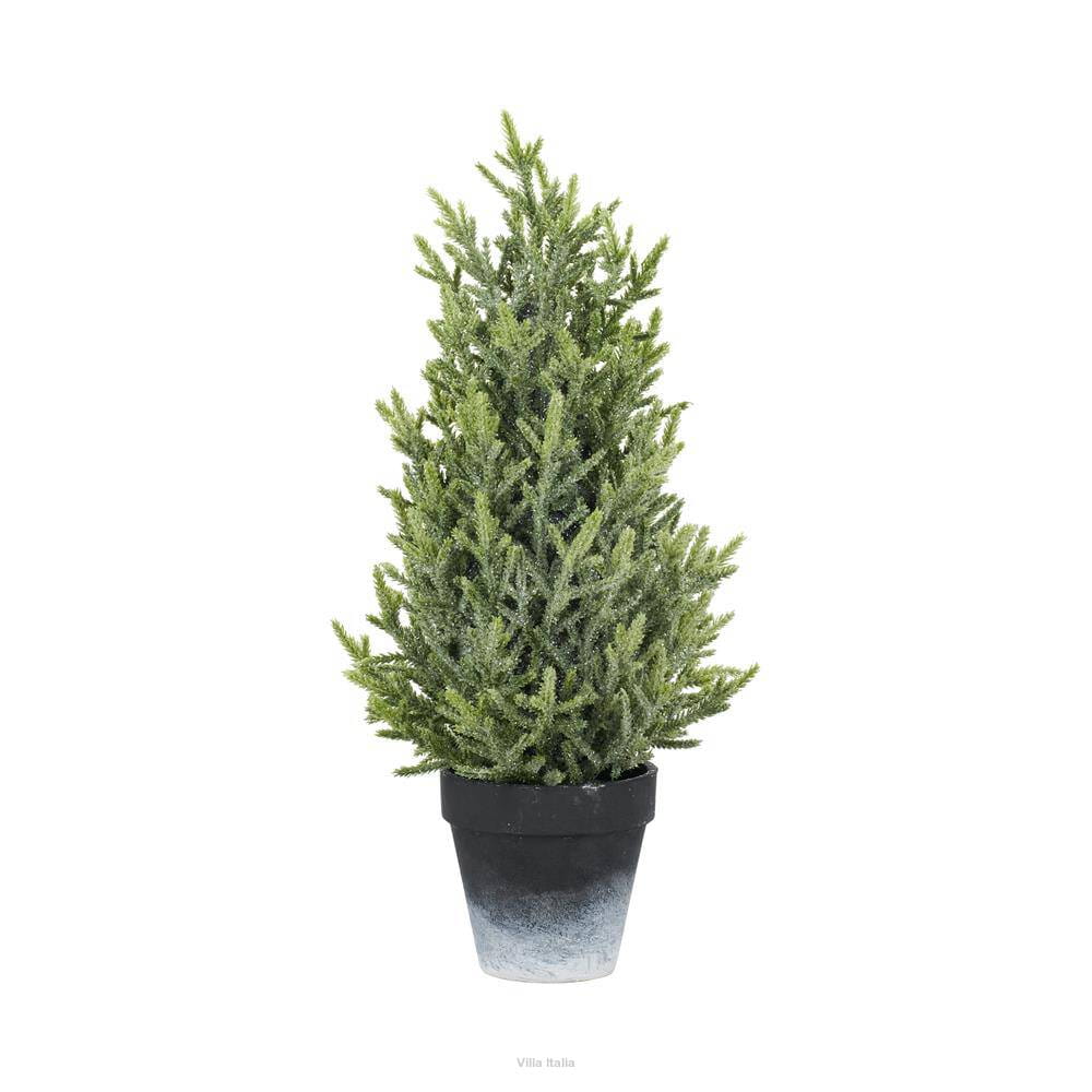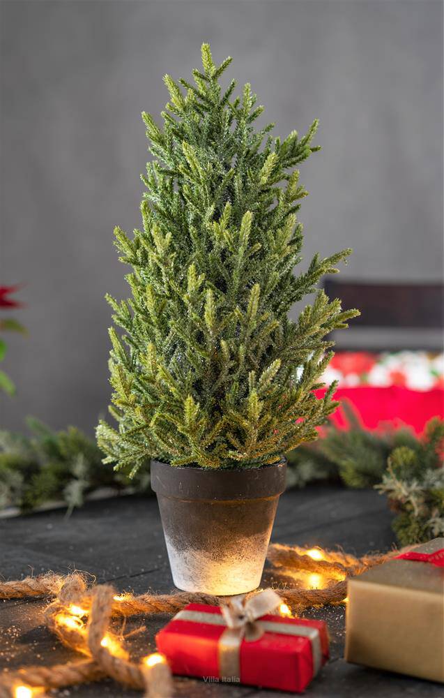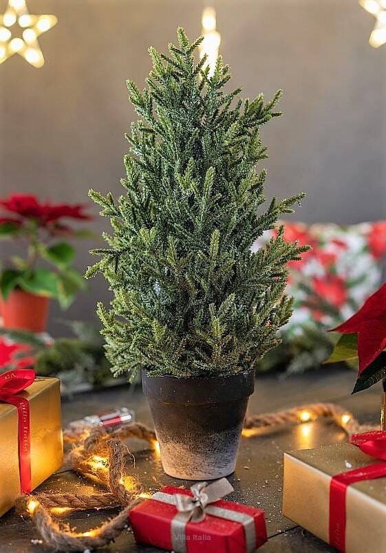 Mała choinka Villa Italia, pokryta mieniącym się delikatnie szronem to prosty sposób na wprowadzenie świątecznej atmosfery gdziekolwiek zechcesz. To niezwykle wygodny i praktyczny model. Jest odpowiednia nawet do bardzo małego pomieszczenia. Osadzona jest w niewielkiej, czarnej doniczce. Możesz ją ustawić w dowolnym miejscu, jak kuchnia, hol, balkon. Możesz także zastosować kilka choinek do spójnej dekoracji Twojej przestrzeni. Choinki wspaniale mienią się w łagodnym świetle, tworząc magiczny nastrój.