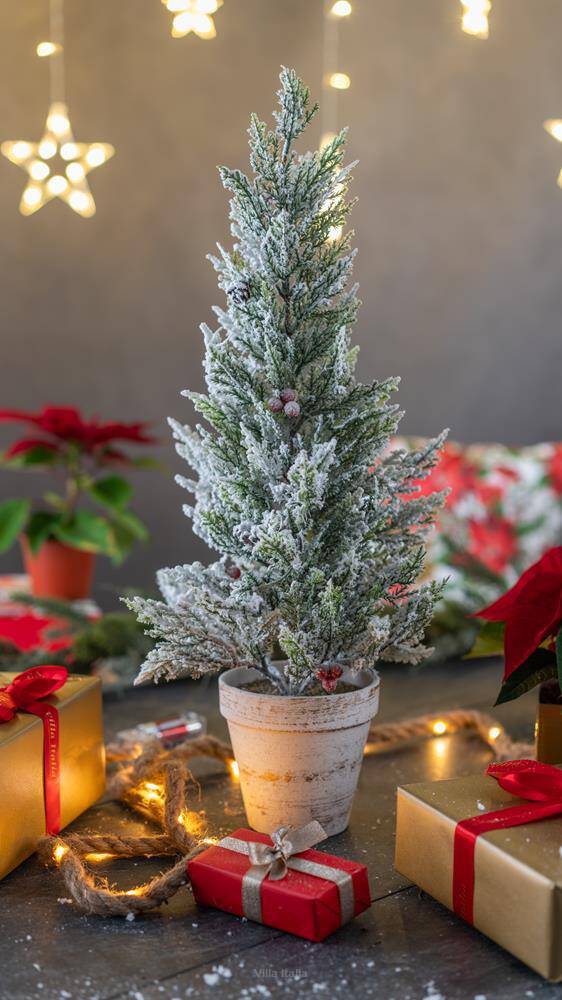 Choinka Villa Italia przypomina naturalną, ośnieżoną roślinę. Zdobiona jest małymi szyszkami i czerwonymi jagodami, dzięki czemu nie wymaga dodatkowych ozdób. Jest lekka, osadzona w białej doniczce muśniętej złotem. Ośnieżona sztuczna choinka to prosty sposób na wprowadzenie świątecznej atmosfery gdziekolwiek zechcesz. Choinka w białej doniczce wspaniale sprawdzi się w aranżacji wnętrza w skandynawskim stylu. To niezwykle wygodny i praktyczny model. Jest odpowiedni nawet do bardzo małego pomieszczenia.